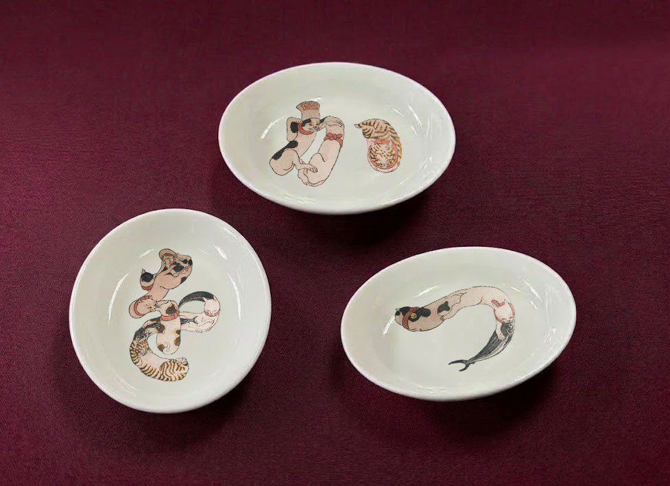 歌川国芳が描いた、《「猫の當字」かつお》アートが3枚セットの豆皿に。